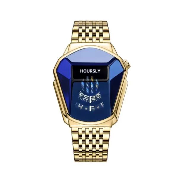 Consiga um novo estilo com uma impressionante bracelete em aço inoxidável dourado e um elegante visor azul.