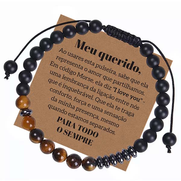 Ao usares esta pulseira, sabe que ela representa o amor que partilhamos. Em código Morse, ela diz “I love you” – uma lembrança da ligação entre nós que é inquebrável. Que ela te traga conforto, força e uma sensação da minha presença, mesmo quando estamos separados.